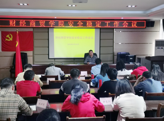 3月16日,财经商贸学院在机电大楼四楼会议室召开安全稳定工作会议,学院全体教职工参会,党总支书记苏自强主持会议。