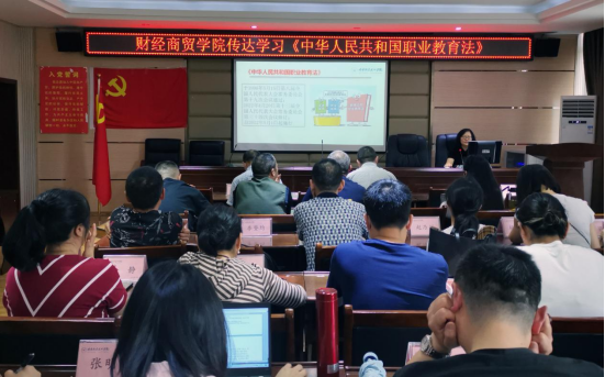 5月11日,财经商贸学院在机电大楼四楼会议室学习贯彻新修订的《中华人民共和国职业教育法》。院长王婷领学,学院全体教职工参会。