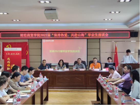 6月23日下午,财经商贸学院在机电大楼四楼会议室召开2022届毕业生座谈会。学院党总支书记苏自强、院长王婷、副院长李攀、教师代表、全体毕业班辅导员及毕业生代表参会。