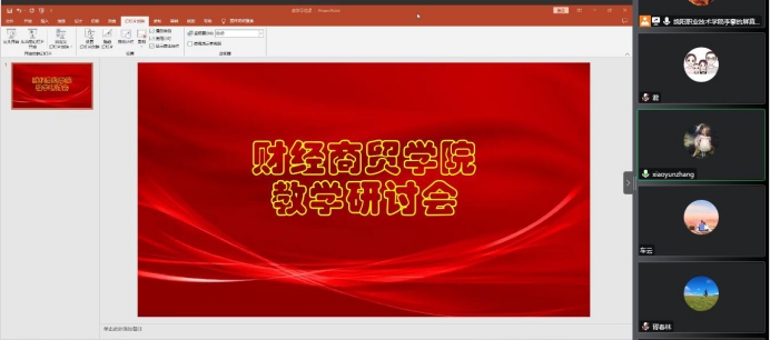 为进一步提升在线教育教学质量,12月29日下午,财经商贸学院教学研讨会通过腾讯会议在线上举行。学校教学督导组组长张晓云、教务处副处长龙君君到会指导,学院工商教研室副教授颜耀懿主讲公开课,全体教职工参加听课,学院副院长李攀主持教学研讨会。