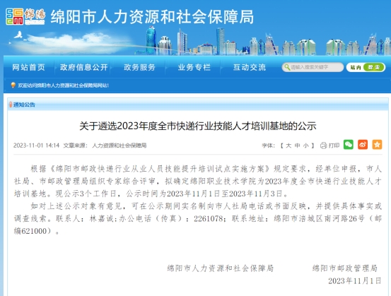 近日,由市人社局、市邮政管理局发布了《关于遴选2023年度全市快递行业技能人才培训基地的公示》,财经商贸学院申报的2023年度全市快递行业技能人才培训基地成功获批。