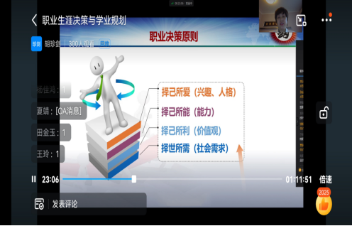 胡珍剑老师首先就大学生入校应当思考什么问题与同学们展开了热烈的线上讨论,然后从如何挖掘生涯决策选项、运用生涯决策方法和工具、找到职业目标进行了深入浅出的讲解,并对如何进行职业生涯规划书撰写和学业生涯规划方法进行了详细的说明。她提醒大家一定要认真规划自己的学业,制定好三年的具体目标并落地实施,以实际行动绘制学业之花。