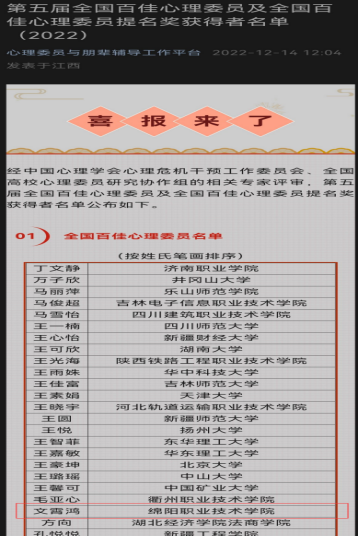 近日,我院学生文霄鸿应邀参加了第十六届“全国高校心理委员工作研讨会与朋辈心理辅导论坛(线上)”并当选为全国百佳心理委员。