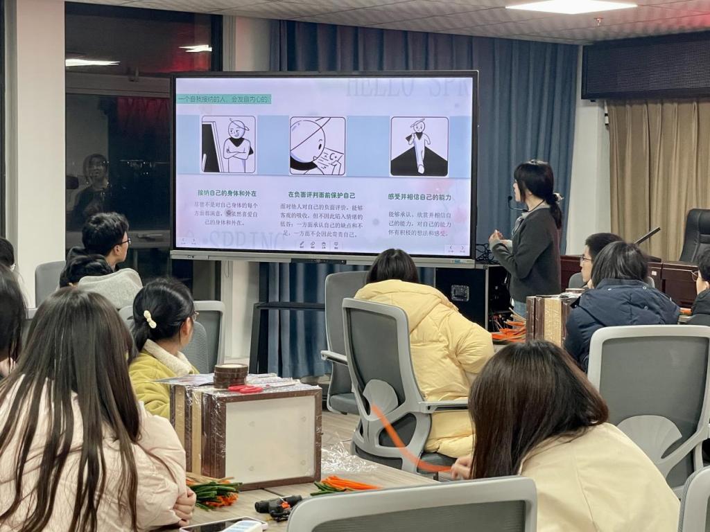 在心理书籍导读环节,尹昊雯霞从“自我怀疑”“过度自我要求”等心理困惑切入,与大家分享了《抱住棒棒的自己》一书,通过解读美国心理学家阿尔波特的自我接纳定义、澄清四大认知误解,系统传递了“接纳不完美才是真实人生”的核心理念。并利用漫画和视频,让抽象的心理知识变得通俗易懂,帮助同学们认清“自我接纳并非躺平,而是在正视自身特质基础上的正向成长”。最后,还分享了“积极内部对话”“优势视角转化”等实用技巧,让同学们掌握了可直接应用于生活的心理调节工具。